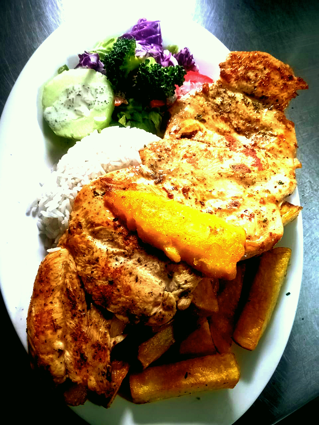 Se elabora con un filete de pollo fresco, marinado con hierbas suaves y especias naturales, luego cocido lentamente a la plancha para lograr una textura tierna, dorada y jugosa. Acompañan esta preparación un arroz blanco graneado, papas nativas bien doradas que aportan textura y sabor, plátano frito que brinda un toque dulce y equilibrado, y una ensalada fresca que añade color y ligereza al plato.